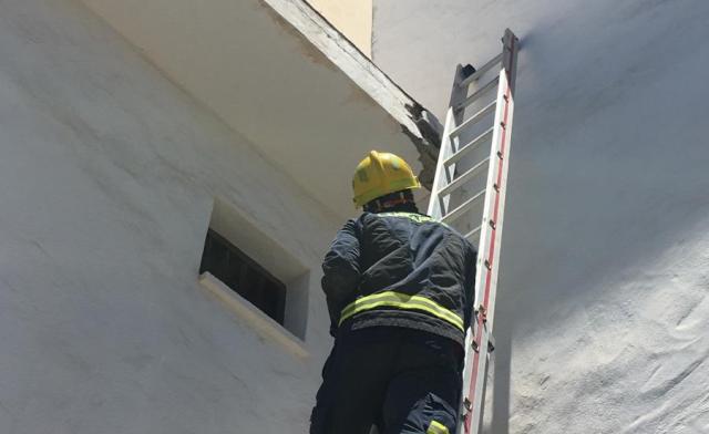 Los bomberos del Consorcio de Seguridad y Emergencias de Lanzarote acudían al mediodía de este jueves al Puesto Principal de la Guardia Civil en Tías para restañar una cornisa en...