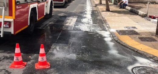 Los bomberos lanzaroteños retiraban con pala y limpiaban la pintura derramada sobre la calzada entre las calles México y Guatemala, después de volcarse allí varios botes.