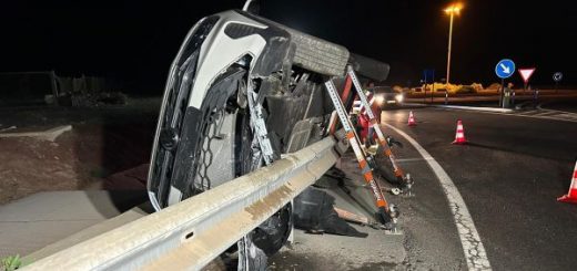 En el accidente, ocurrido en la glorieta de Lanzarote a Caballo, el vehículo se salió de la carretera y quedó volcado lateralmente, encajado entre el quitamiedos del asfalto y un muro de hormigón.