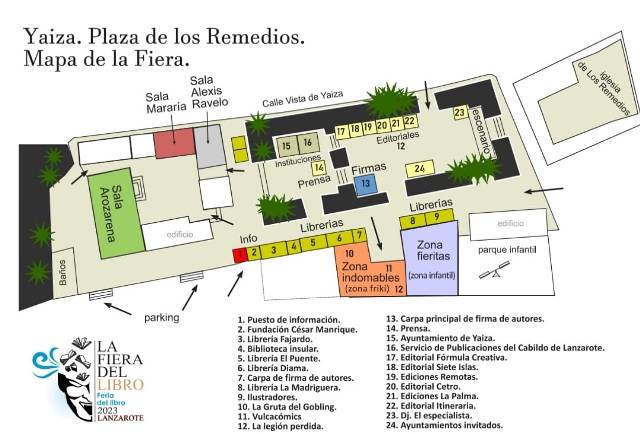 La Fiera del Libro albergará los stands institucionales de los ayuntamientos de Yaiza, Teguise y Tinajo, el Servicio de Publicaciones del Cabildo de Lanzarote y la Biblioteca Insular; de las librerías El Puente, Fajardo, Diama y La Madriguera, y de las editoriales Formula Creativa, 7 Islas, Ediciones Remotas, Itineraria, Cetro y La Palma. También contará con carpa expositiva y de venta la Fundación Cesar Manrique y habrá espacios específicos de información de la feria, para firmas y de trabajo, para medios de comunicación.