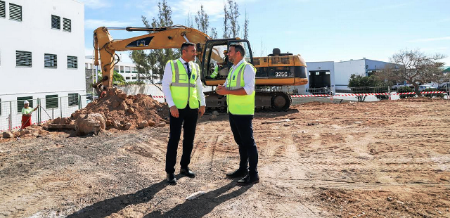 El presidente del Cabildo de Lanzarote, Oswaldo Betancort, y el vicepresidente y responsable de Obras Públicas, Jacobo Medina, visitaron ayer lunes el inicio de la intervención y comprobaron de primera mano los primeros avances del futuro parking situado junto al Hospital Universitario Doctor José Molina Orosa.