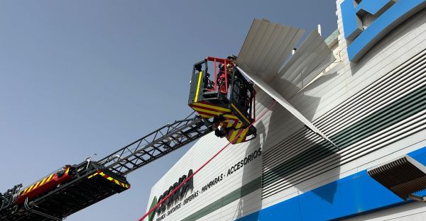 Entre las intervenciones realizadas destaca la actuación en una gasolinera de Tahíche, donde los bomberos tuvieron que asegurar desde el interior la estructura metálica del techo de un almacén, cuyas planchas se habían soltado por efecto del viento.
