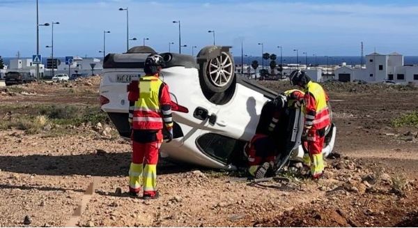 Espectacular salida de vía y vuelco de un turismo en Tahíche, sin heridos