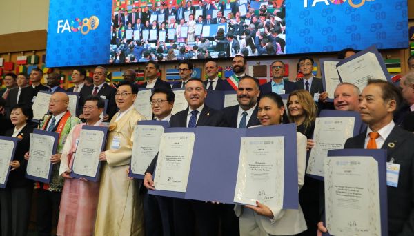 El presidente Oswaldo Betancort recogió la distinción en la sede de la Organización de las Naciones Unidas para la Alimentación y la Agricultura, acompañado por la vicepresidenta María Jesús Tovar, el consejero de Paisaje y Soberanía Alimentaria Samuel Martín y el equipo técnico que impulsó la candidatura.