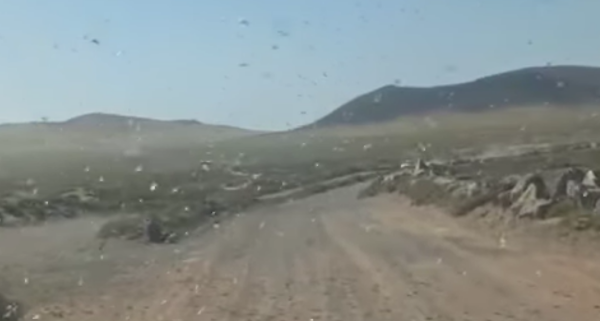 Las imágenes muestran a un número inusualmente alto de langostas posadas en la carretera antes de continuar camino.