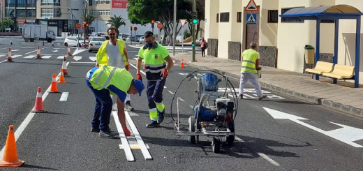 El Área de Movilidad de Arrecife realiza trabajos en las vías principales para repintar las marcas viales y dar más seguridad. Algunas en zonas clave serán reflectantes.