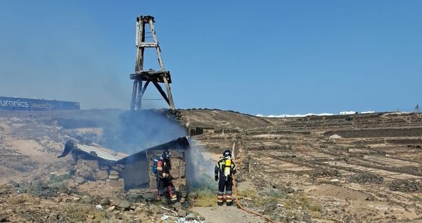 Tras el aviso, una dotación de bomberos se desplazó rápidamente hasta el lugar, donde confirmó la existencia de un incendio en uno de los molinos situados en las antiguas salinas de Puerto Naos.