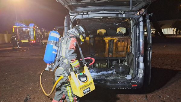 El incendio en la calle León y Castillo de Arrecife se producía en un llano situado junto a un colegio. Una furgoneta ardía allí en su totalidad. Los bomberos sofocaron el fuego, mientras que los agentes de la Policía Local prestaron asistencia técnica.