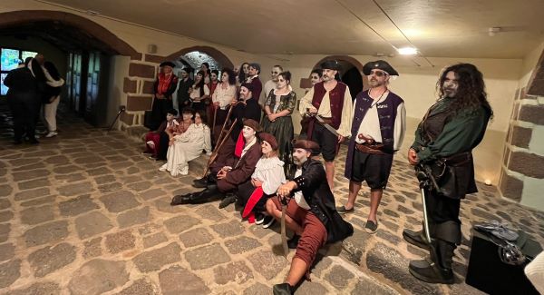 La imagen superior corresponde al Grupo de Teatro Actúa, que puso un año más en marcha en el Castillo de Santa Bárbara “La Noche Negra” sobre las invasiones piráticas que sufrió este pueblo durante siglos.